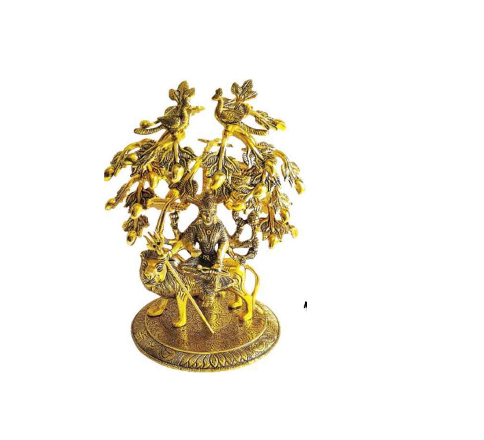 Add a touch of divine elegance to your space with this beautifully handcraft SheraWali Mata Brass Idol Under Tree of Peacock l. This exquisite piece features SheraWali Mata Idol, both under a detailed tree adorned with birds and intricate leaves